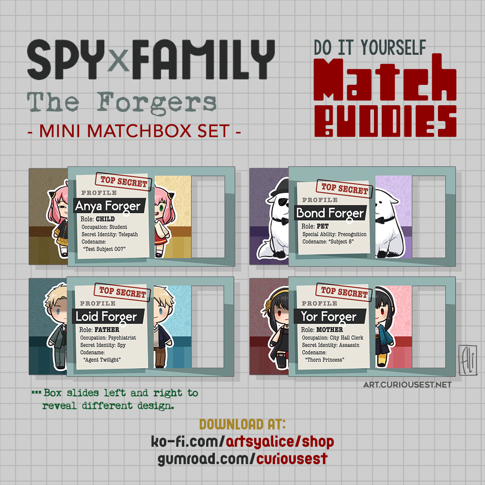 Tiny Do-It-Yourself matchbox-sized goodies! This set has four designs featuring the Forger Family: Loid, Yor, Anya and Bond Forger from SPY X FAMILY!
