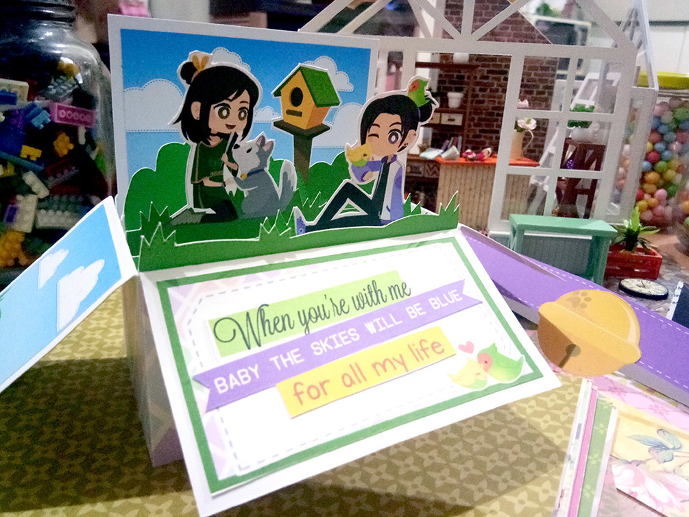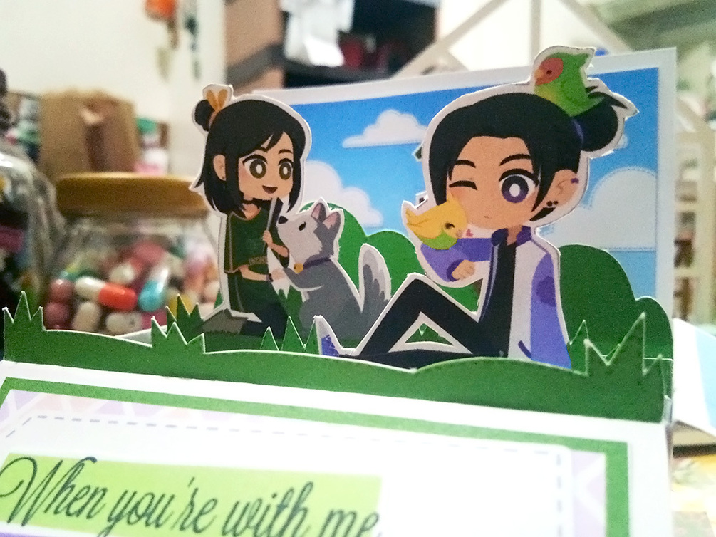 A simple card that unfolds to a cute scene of Jiang Cheng, Nie Huaisang & some cute lil friends! You can customize with your own sentiment in the front design and/or add a message on a special space at the back of the card.